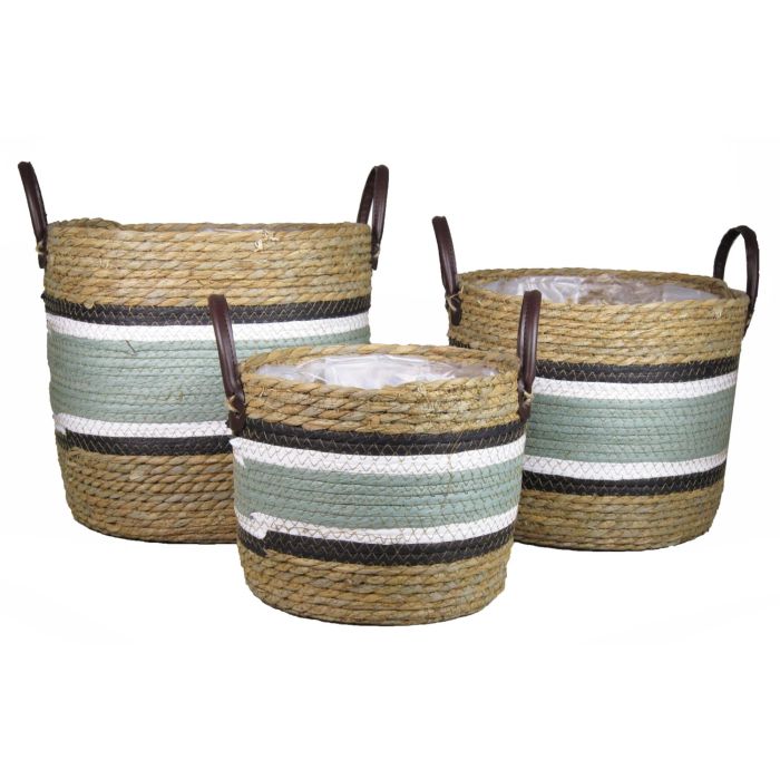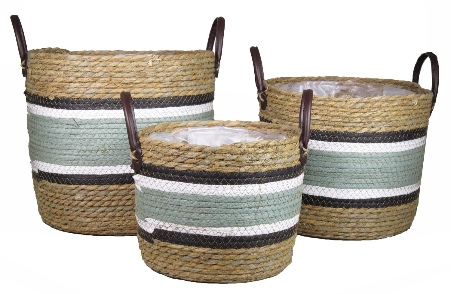 Planter basket KIONA with handle, 3 pieces, mint-beige, 8"-12"/20-30 cm, Ø 10"-14"/25-36 cm
