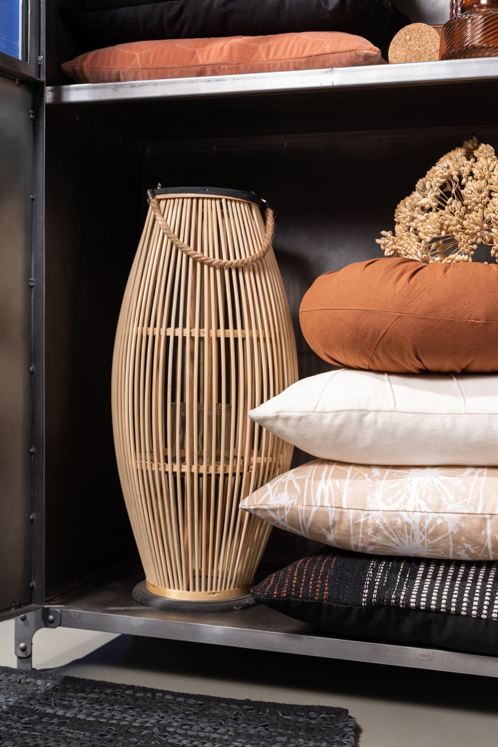 The wooden lantern KOLLINA in beige with handle is an eye-catching decorative accessory.