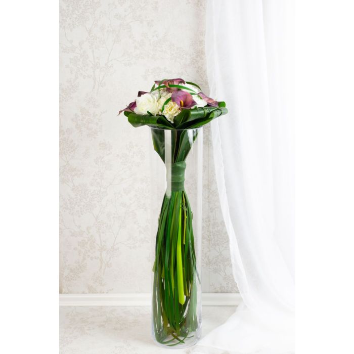 The wedding bouquet for eternity! Janine contacted us by phone. She told us about her bridal bouquet and her wish to have it made from artificial flowers as a memento of her big day. She sent us a photo of her extravagant sceptre bouquet. As is typical for this type of bouquet, it presented itself with strikingly long stems and blades of grass, which form a sceptre through a wide tightly corded ribbon. The choice of flowers used was elegant callas, classic roses and white carnations as a sign of fidelity. Wrapped cordyline leaves rounded off the bouquet. We were able to select artificial flowers as described. Tying our first sceptre bouquet initially presented us with a challenge. Due to the smooth artificial surface, the leaves slipped when tied together. The blades of grass could also only be tied stalk by stalk with difficulty. We proudly presented our first proposal to Janine. She was enthusiastic about our work, but wished for smaller flowers, as they were not that big in the original. Roses and carnations were quickly found in the warehouse, but another purple calla was not available in our range. We then searched numerous supplier lists for such a flower. This took a lot of time, but was finally rewarded in a positive way. Without further ado, we ordered the small calla and added it to our assortment. By replacing the flowers, the bouquet promptly lost its diameter. Now the size also corresponded to the original, which meant that we also received the approval of the order from this customer. Do you also want an artificial wedding bouquet for eternity? Shop the Look!