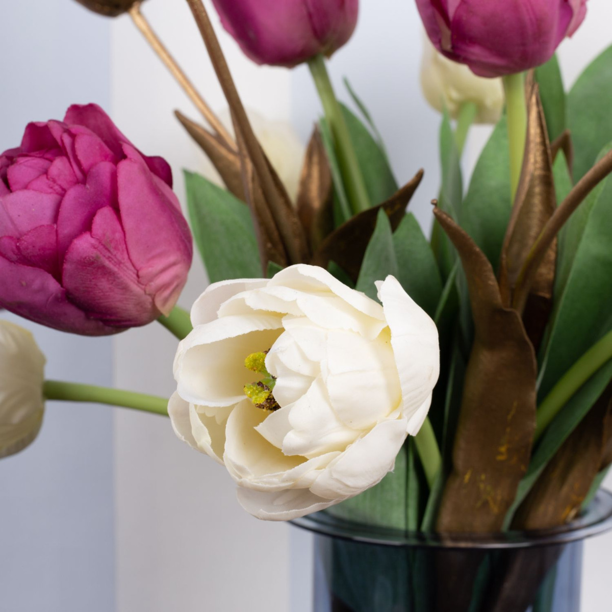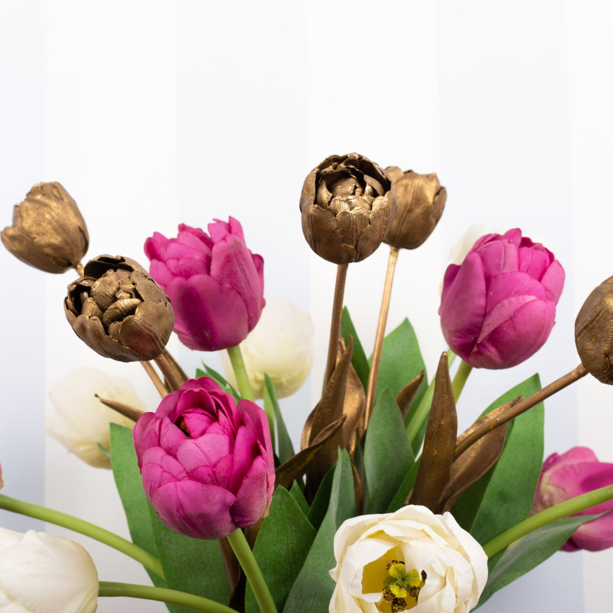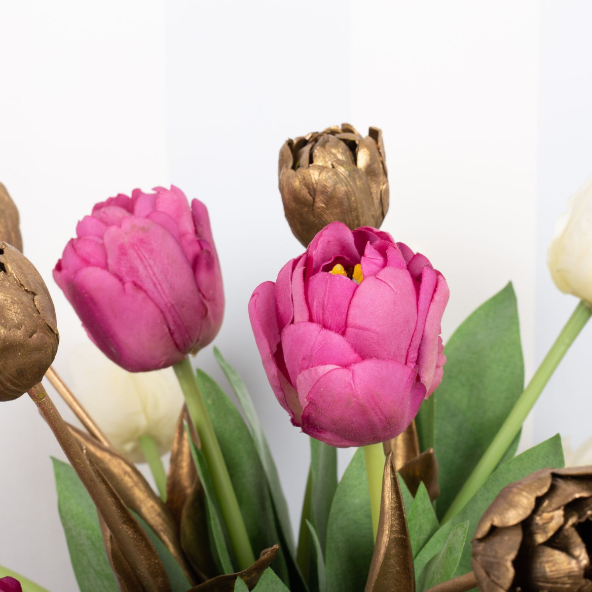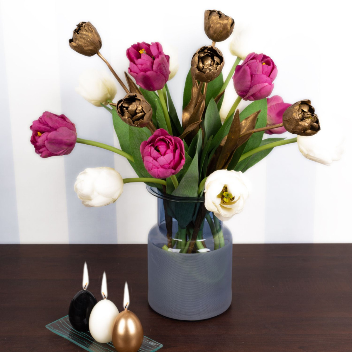 Think Pink! Spring at last! After a long winter, we are literally waiting for a few rays of sunshine and the spring that goes with it! But even before the tulips start to bloom in nature, we can bring the colourful season into our homes. Our tulips in pink and white look so real that you have to look twice to realise they are artificial flowers. Golden tulips make the look especially modern and unique. Anyone who thinks that the time for candles is over with the cold season is mistaken. People also like to light a candle at Easter. Bring spring into your home! Shop the Look!