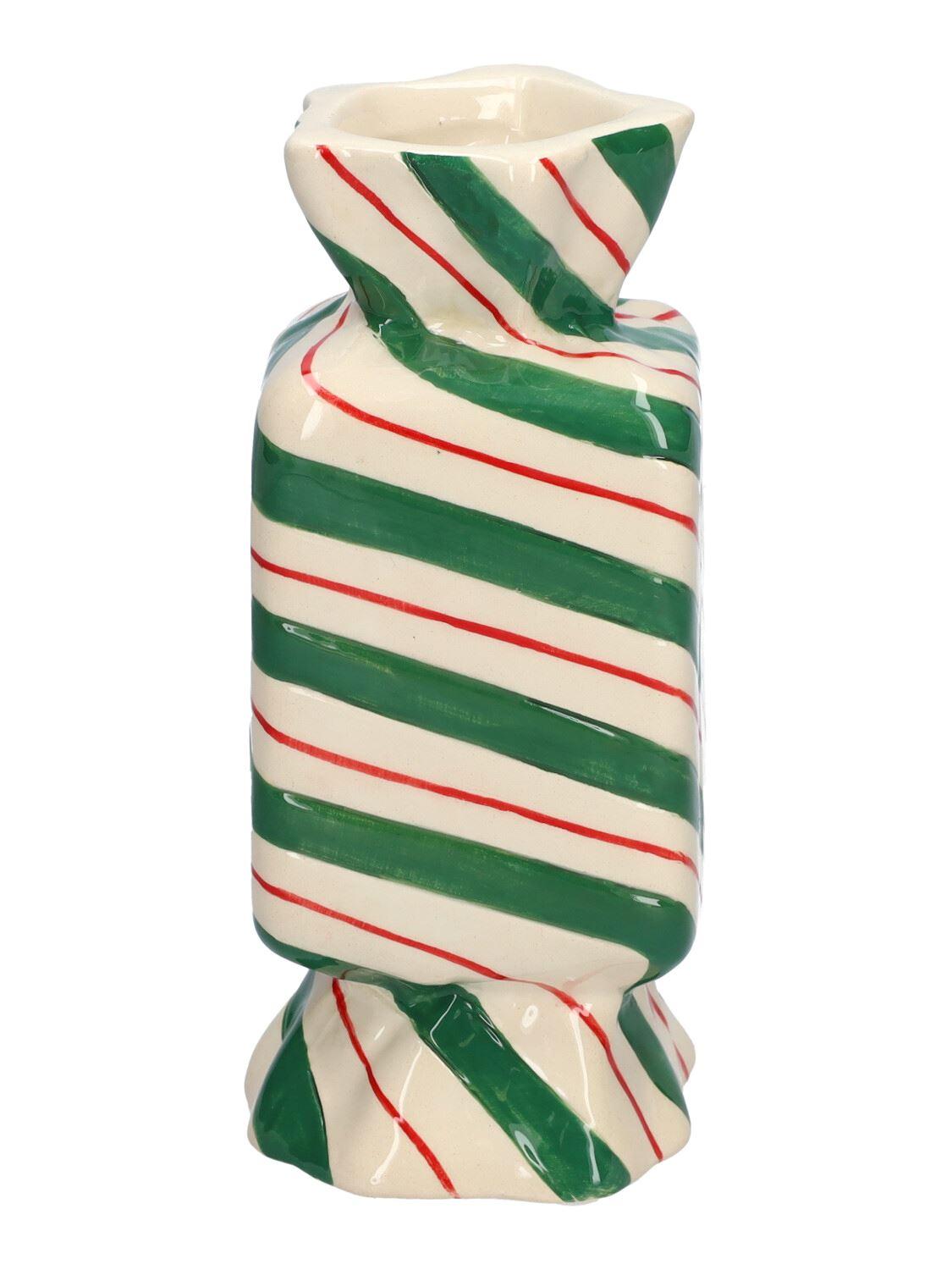 Square single flower vase in the shape of a sweet AMIEL made of ceramic, with diagonal lines, green-red-white, 2.6"x2.6"x6"/6,5x6,5x15cm
