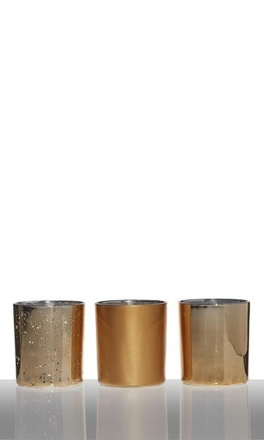 Tea light holder LYLA made of glass, 3 pieces, gold, 3.1"/8cm, Ø3"/7,5cm
