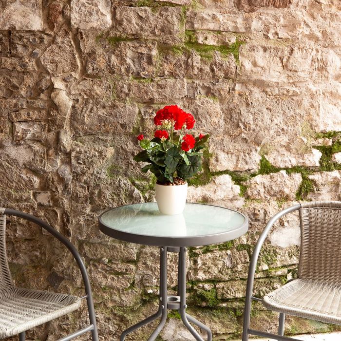 A bright red! Geraniums never go out of fashion. In summer, they often adorn balcony railings with their bright colours. Our fiery red geranium looks so real that you have to be careful not to water it by mistake, because the plant granulate, which is also suitable for real plants, literally invites you to do so. Shop the Look!