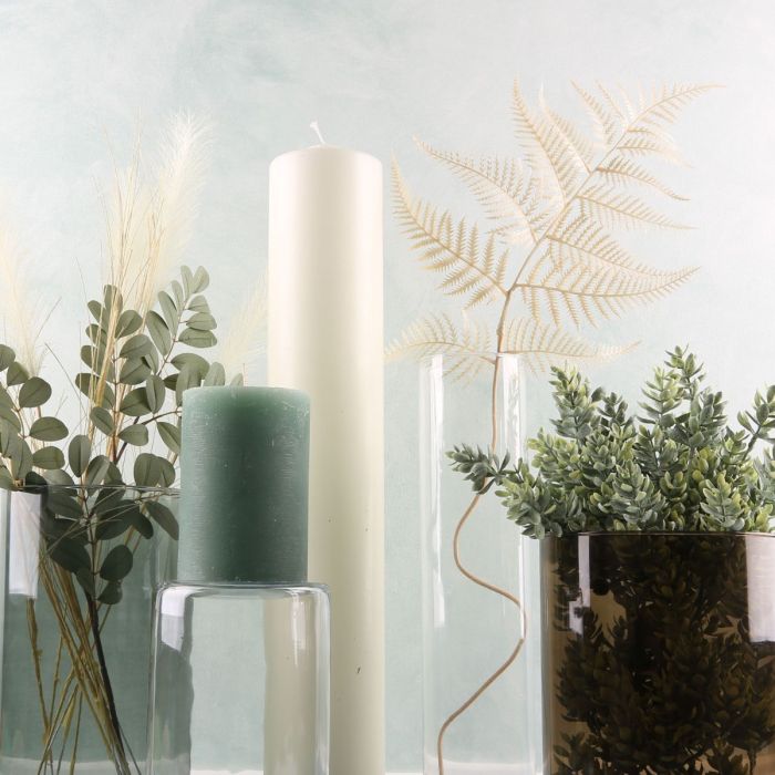 Eucalyptus green and off-white! This look offers elegant year-round decoration for lovers of classic designs. A collection of Sanya vases in different heights and colours is the basis of the look. The highlight: if you turn a vase upside down, you get a candle holder. The small candle in the trend colour mint green reaches the height of our huge floor candle. The cream-coloured fern fronds perfectly match the delicate feather grasses and grey-green branches. This decoration is always appropriate, summer or winter. Shop the look!