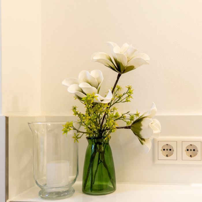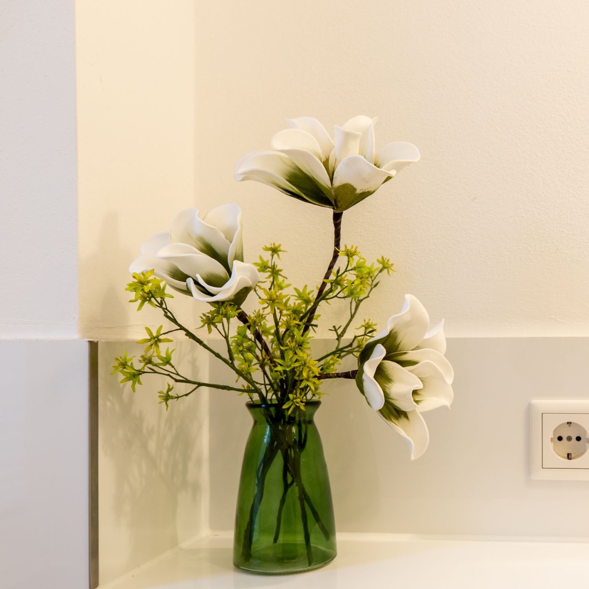 White and green! Calming colours in a place where you want to be left in peace. Bathrooms are rarely very spacious, which is why small decorative elements are particularly suitable. A small vase decorated with a magnolia branch and a deutzia goes well with the bright green of the vase and can also be used in small bathrooms. For those extra relaxing hours, we have added a lantern with a pillar candle, which is the perfect invitation to enjoy a relaxing bath. Shop the Look!