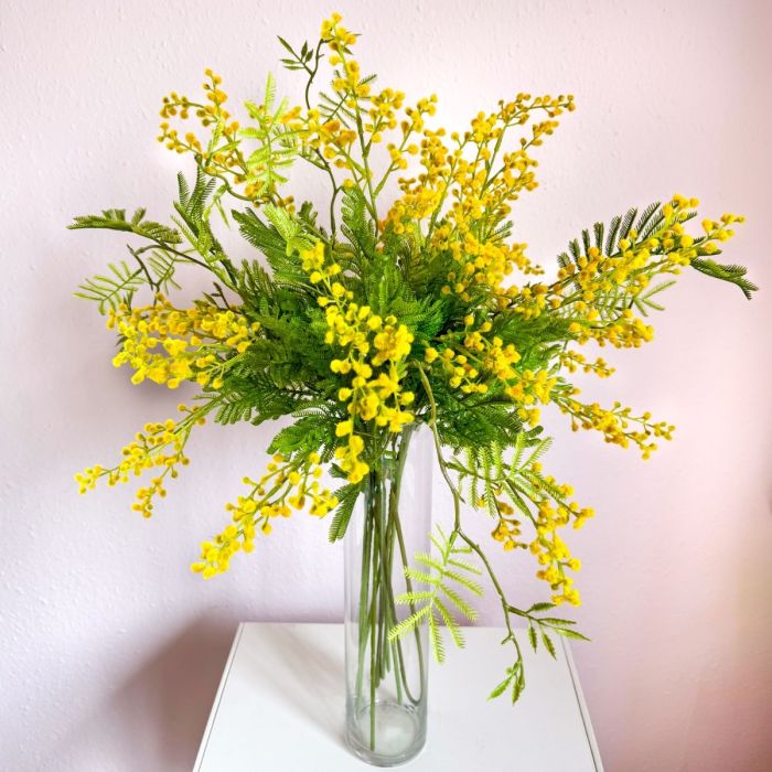 A touch of sunshine – bring the lightness of nature into your home! This mimosa bouquet radiates pure lightness and joie de vivre. The delicate, feathery leaves in fresh green form a harmonious contrast to the bright yellow flower heads, which look like little rays of sunshine. Arranged in a simple, tall glass vase, the natural elegance of the mimosa is perfectly showcased. The bouquet looks fresh, lively and delicate at the same time – ideal for adding a cheerful, sunny touch to any room. A real eye-catcher that brings spring and warmth into your home. Shop the look!